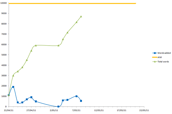 So close! Though I haven’t hit my 10k goal just yet, I have already started the editing process. I’m glad I’ve got another fortnight to clean up the document. Right now, it’s in what I would call a stream of consciousness format. Heh. On the other hand, I’m pretty happy with the sections I have edited, and my core concepts are holding up for the moment (only against my own scrutiny though; who knows what will happen when I submit the draft to my supervisors…).